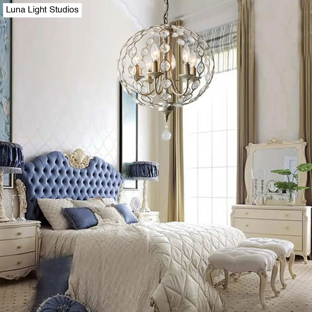 This chandelier is made with a metal frame and has an aged silver finish. The chandelier has six lights and each light is encased in a sphere of clear crystal. The metal chain is adjustable, so you can customize the chandelier to your desired length. The chandelier uses E12/E14 light bulbs (not included). This chandelier is perfect for adding a touch of elegance to any room.
