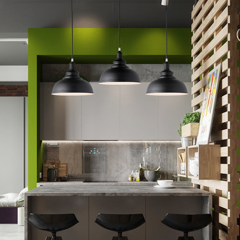 This is a one-head pendant light with a rustic bowl shade. It is made of metal and is designed for hanging from a ceiling. It is available in small, large, and extra-large sizes. The width of the fixture is 12", 15.5", and 18.5", respectively. The height of the fixture is 9.5". It is available in black, white, black-white, and rust colors. The bulb is not included. The voltage is 110V-120V or 220V-240V. The light type is LED, incandescent, or fluorescent.