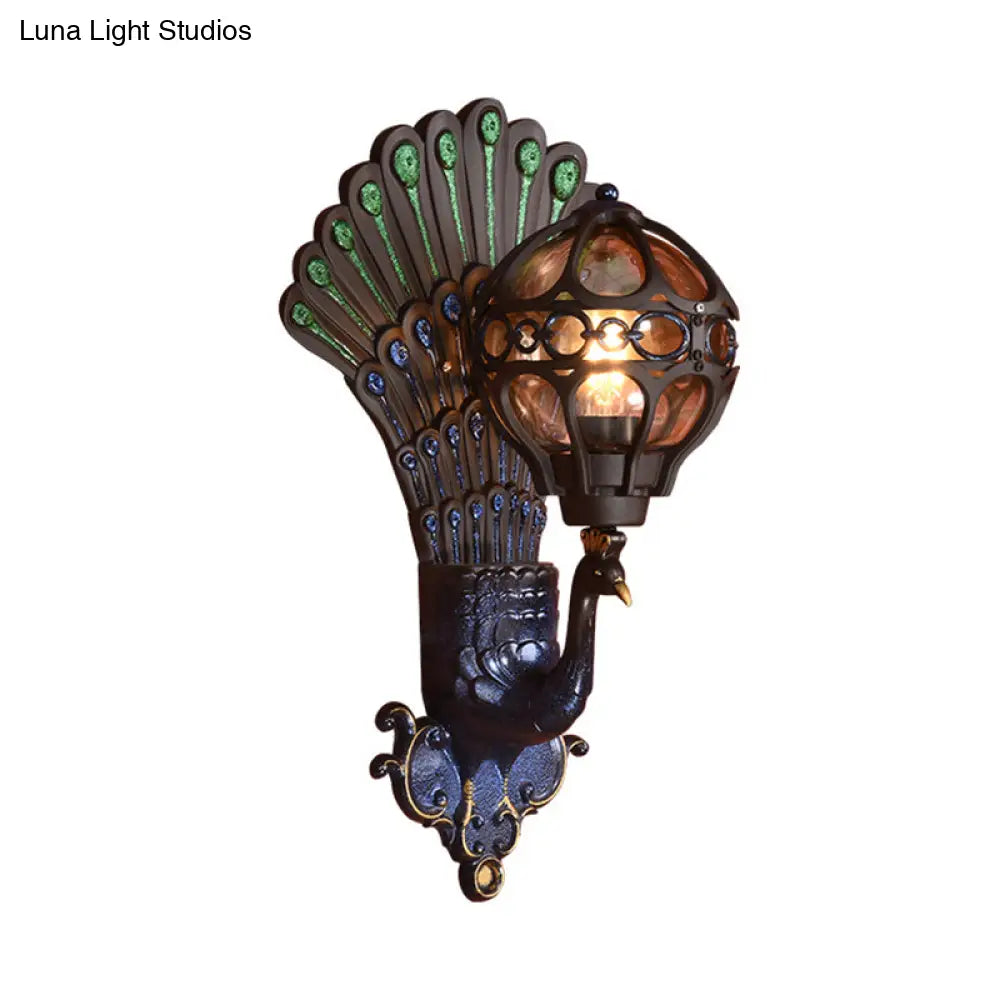 Classic Clear Glass Sphere Wall Light with Peacock Backplate - Black