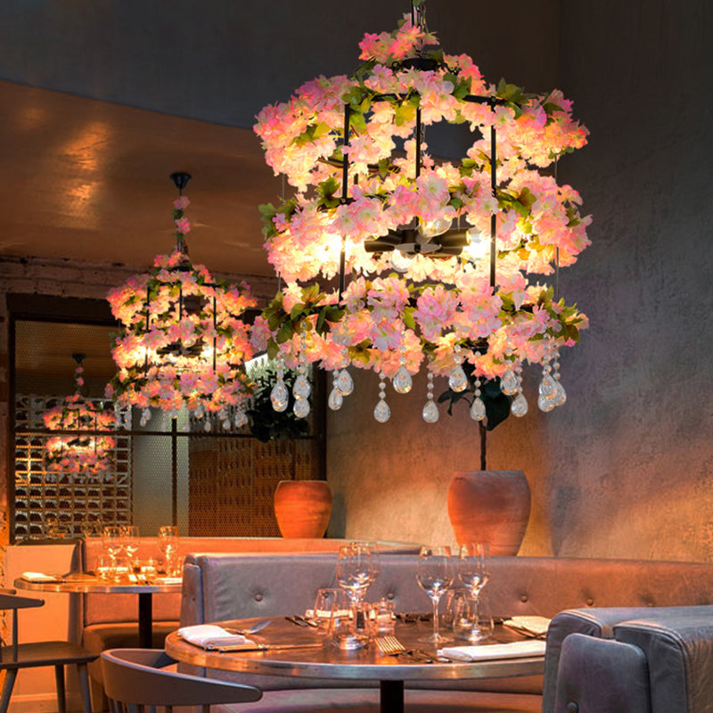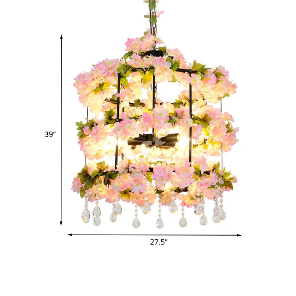 Iron Chandelier with Antique Black Finish, Cylindrical Cage Design, Crystal Drops, and 6 Bulbs - 27.5"/39" H