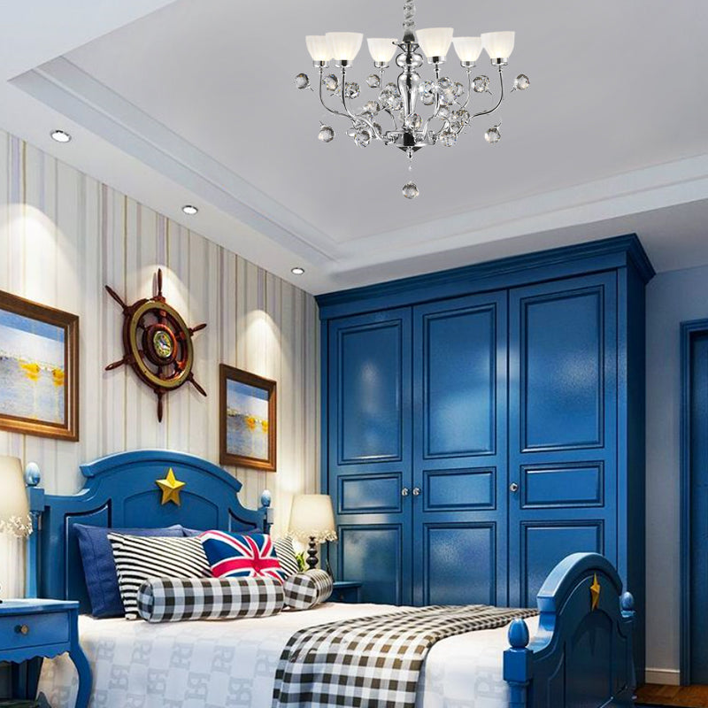 Modernist Frosted Glass 6-Light Conic Chandelier with Crystal Ball Pendant in Polished Chrome