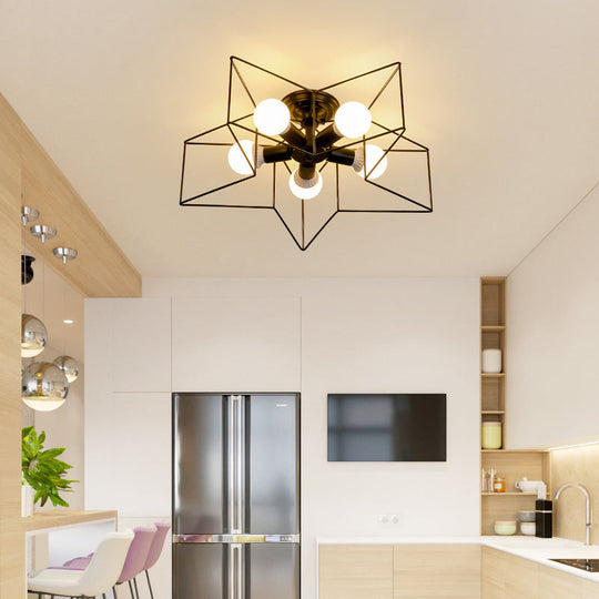 Vintage Metal Star Shaped Bedroom Ceiling Lamp - Semi Flush Mount With 5 Bulbs / Black
