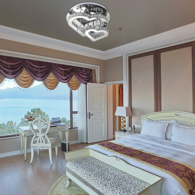 This ceiling light is a modern design with a chrome finish. It has a clear crystal heart in the center that casts a warm or white light depending on the type of bulb used. The light is an LED and is semi-flush mount so it is perfect for lower ceilings. The light fixture is made from metal.
