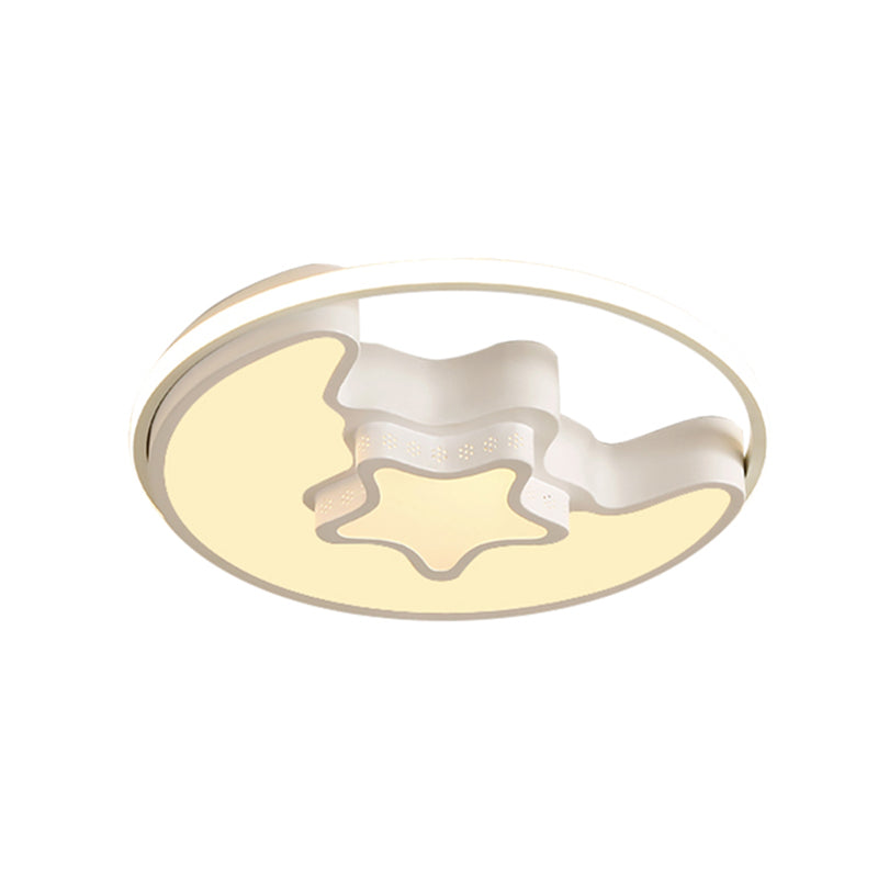 This contemporary star moon flush mount light is perfect to illuminate your foyer in a modern way. The metal white etched ceiling light comes in a size of 15 to 19 inch and a fixture width of 19 inches. It is complete with a ceiling plate and comes with a bulb included, making it an easy-to-install and stylish solution. The fixture type is flushmount and is made of acrylic with a white color temperature, white warm remote control, stepless dimming and color. The bulb base of this light is SMD and its maximum bulb wattage is 39 Watts or under. The light type is LED and its voltage range is 220V-240V for 110V-120V. The style of this ceiling light is Kids, making it a fun and decorative accessory for any child's bedroom. This flush mount light is sure to blend in with any contemporary-designed home, giving it a stylish appeal.