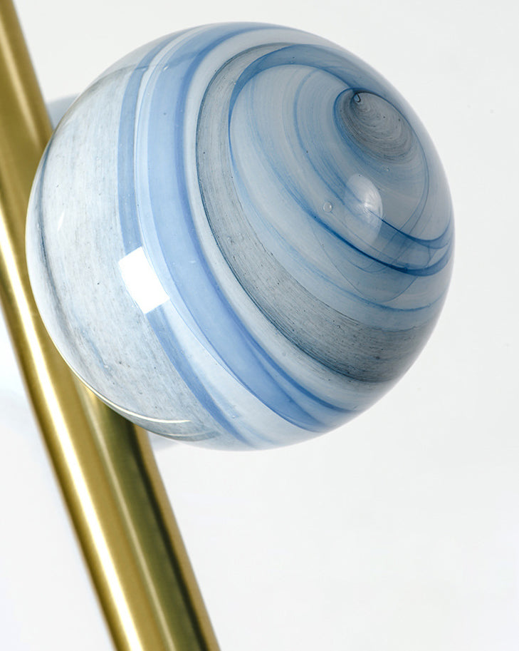 This modern, minimalist chandelier features a linear light fixture with a spherical frosted glass shade. The chandelier has three lights, each with its own bi-pin base. The light is encased in a metal frame with a black gold finish. The chandelier hangs from a cord and can be mounted on the ceiling.