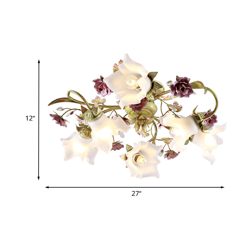 Romantic Opal Glass Semi Flush Light With Green Flower Design - 6 Heads Spiral Ceiling