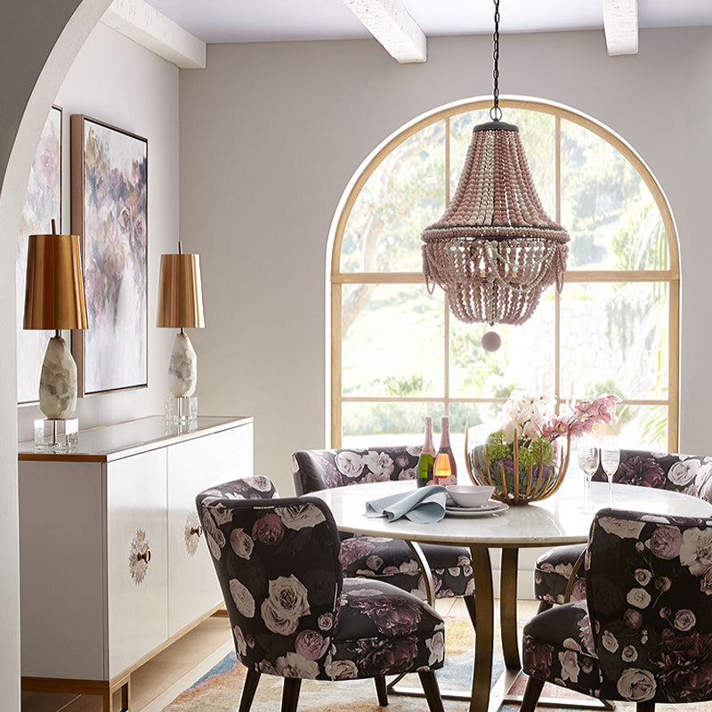 This laser cut empire chandelier has 8 heads and is made of wood. The shade is pink and blue, and the fixture is 31.5" high with a 19.5" width. It uses E12/E14 bulbs (not included) and is rated for use with 220V-240V or 110V-120V.