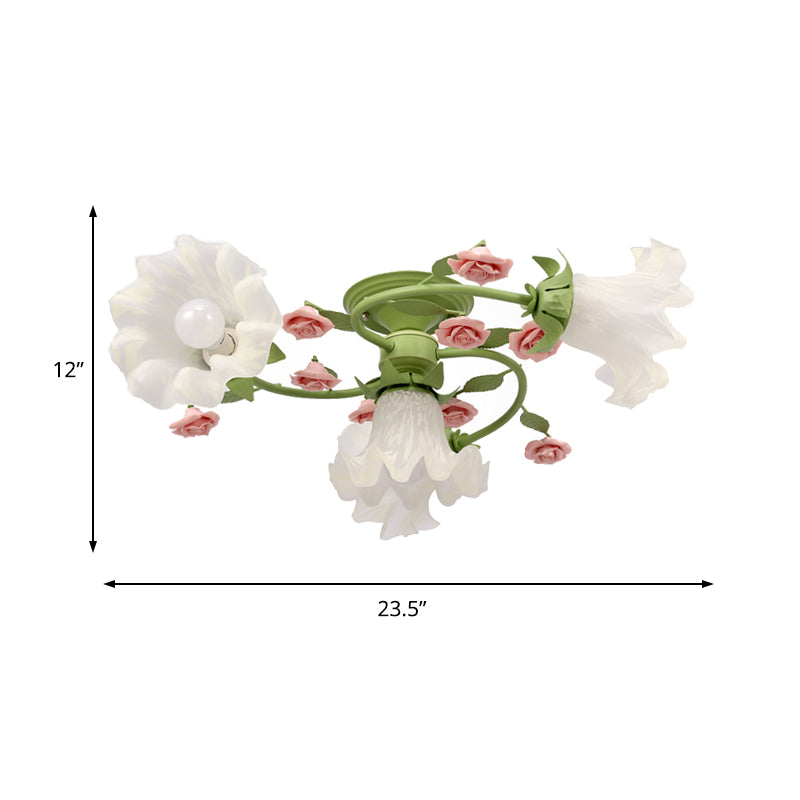 Green Milk Glass Scalloped Ceiling Light Fixture - Pastoral Style, Semi Flush Mount with 4 Heads - Perfect for Bedroom Lighting