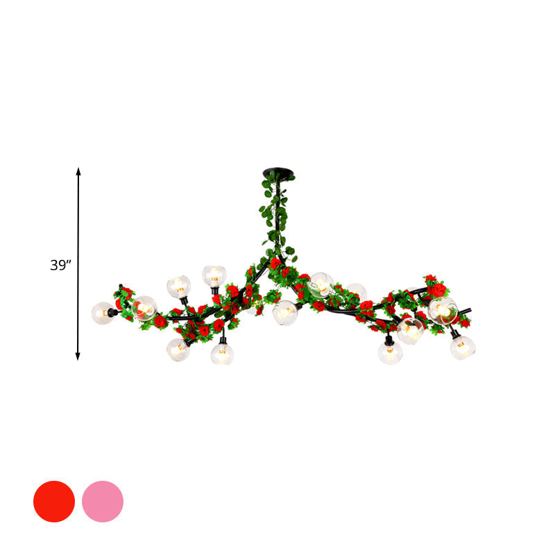 Sputnik Dining Room Semi Mount Lighting Loft Metal 15 Heads Green Ceiling Mounted Fixture with Red/Pink Flower Vine.