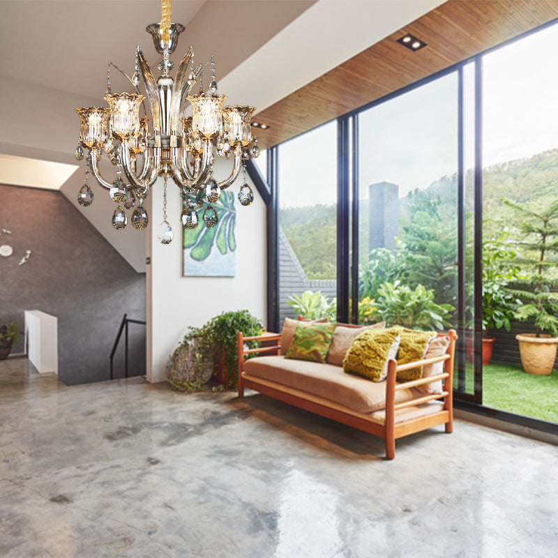 Amber Pendant Chandelier Light With Floral Clear Glass Shade - Modern Living Room Fixture 6/8-Bulb