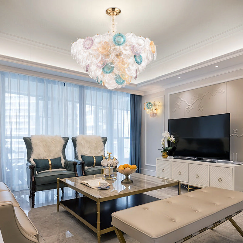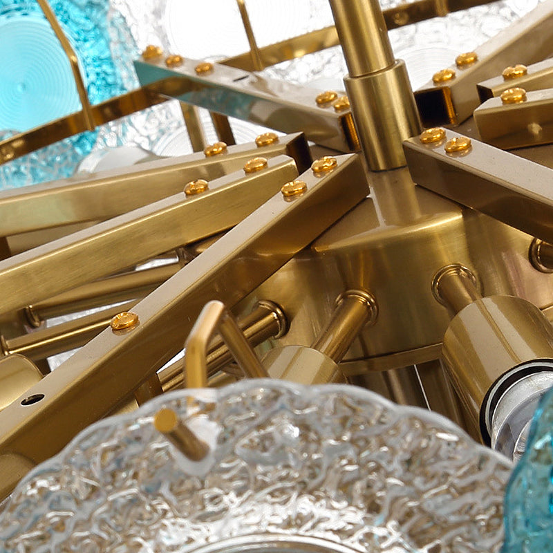 This product is a beautiful and modern chandelier that would be perfect for any home. It features a conical shape with 12 bulbs, clear crystal shades, and a brass finish. The chandelier is 20.5"/25.5" wide and 15"/14" tall, and has a round canopy. It uses E12/E14 bulbs (not included) and is rated for 220V-240V or 110V-120V.