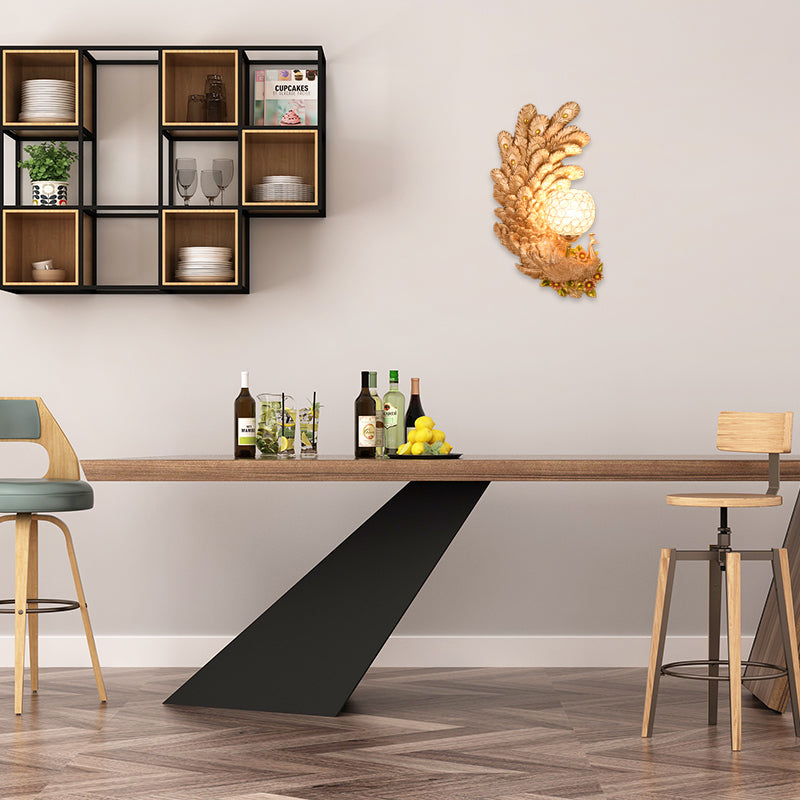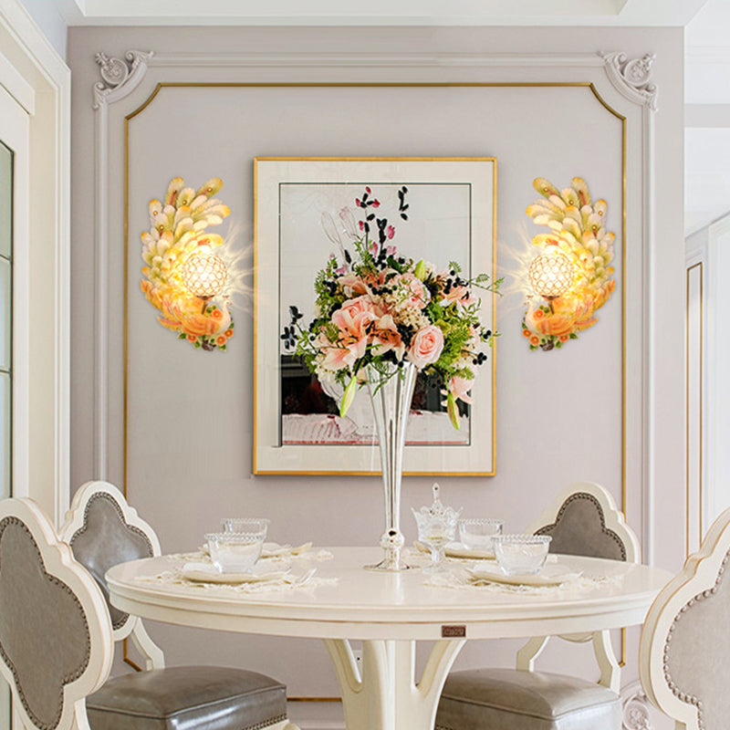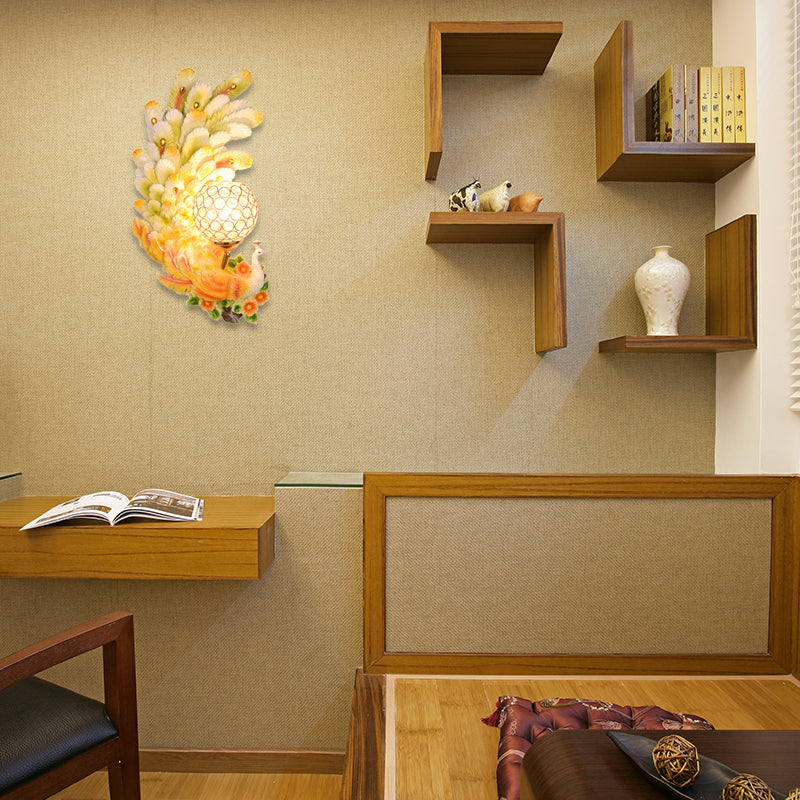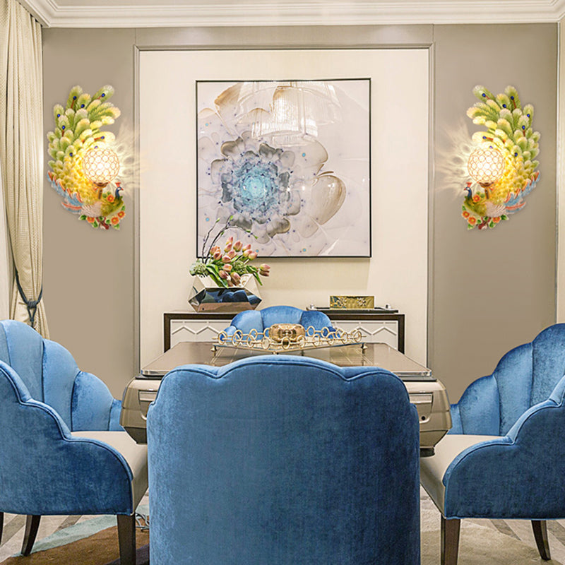 This wall light is a stunning piece of art that adds plenty of lift to a dull room. Its compact shape is perfect for any wall, while the bright colors will lend a cheerful atmosphere to any environment. The unique peacock shape symbolizes grace and beauty, perfect for settings that are modern or traditional. Whether in your living room, bedroom, dining room or entryway, this wall light will help to create the perfect ambiance in any room. With this Double/Left/Right Peacock Wall Lighting Country Resin 1 Light Sconce Light with Dome Crystal Shade in Yellow/Green, 1/2 Packs, you will be able to enjoy the beauty of nature, while still embracing modern simplicity.
