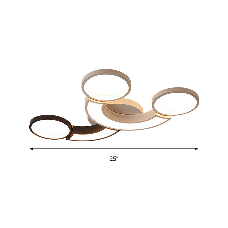 This breathtaking black and white three-circle ceiling light is a modern metallic LED ceiling lamp that emits a soft white light. This incredible product is constructed with top-grade acrylic, precisely measuring 25 inches in length and 24 inches in width, making it ideal for larger living spaces. It has the capacity of three round light sources with the maximum bulb wattage of 40-59 watts, making it powerful enough to cast beautiful light around the room. In addition, it is equipped with a remote control that allows for stepless dimming, so you can easily control the intensity of the white light to suit your needs. What's more, the high-quality LED lights have a long lifespan, and the SMD bulb base makes for easy installation. Lastly, with its modern style, this ceiling lamp will bring elegance to your living space and be a perfect addition to any room.