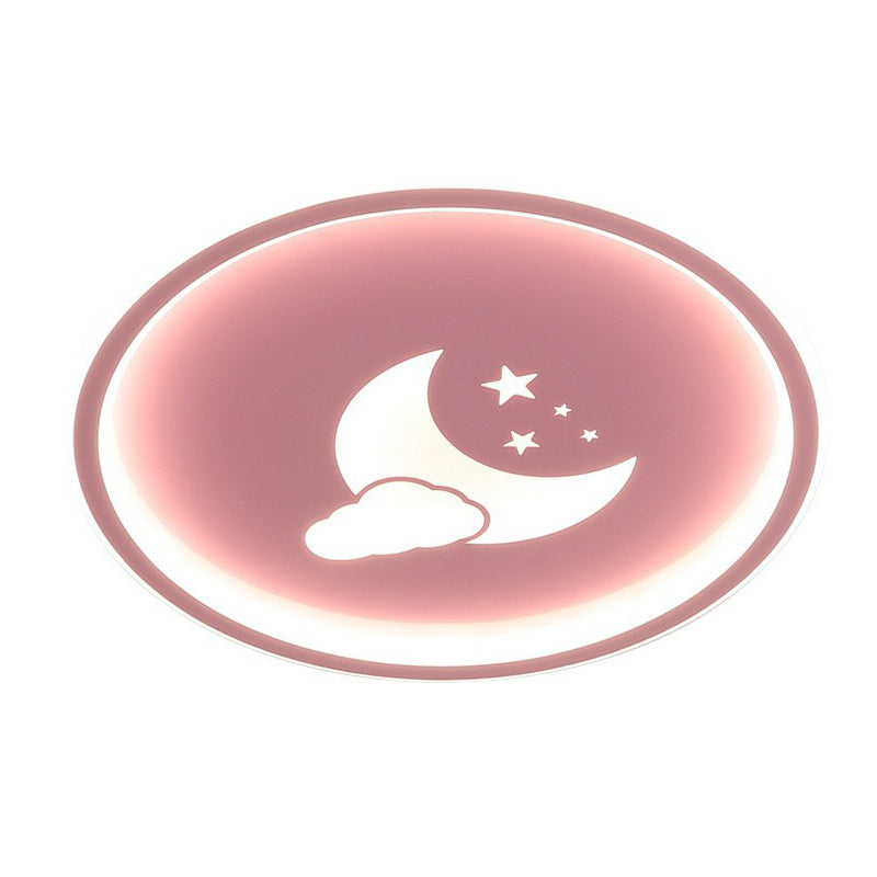 This product, titled "Metallic Ring Shaped LED Flush Mount Lighting Nordic Style Flush Mount Ceiling Light with Star and Moon Pattern", falls under the category of ceiling lights. Its key features include a LED light type, a SMD bulb base, a voltage of 110V-120V or 220V-240V, a white warm color temperature, and a third gear remote control stepless dimming natural style. This product is also pink, white, or blue, has a Kids style, and is made of metal. Additionally, this flushmount light is 16 inches wide by 19.5 inches wide, has a bulb included, and a maximum bulb wattage of 39 watts or under.