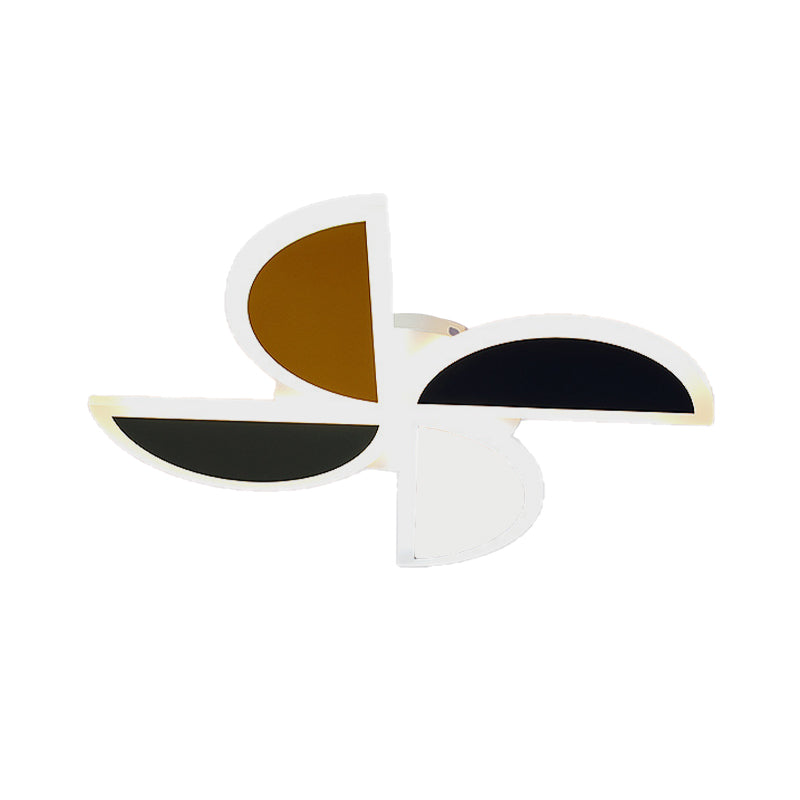 This Ceiling Lamp is called the "Nordic Windmill Acrylic Ceiling Lamp." It is a flush mount, LED light with a green-yellow-pink theme. There are four lights in total and the maximum bulb wattage is 39 watts. The product dimensions are 19.5"W x 23.5"L x 16"H. The light color can be changed with the included remote control.