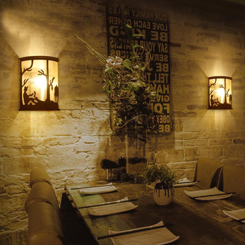 Rust One Light Retro Metal Sconce With Unique Tree/Elk Pattern Stylish Half Cylinder Lighting