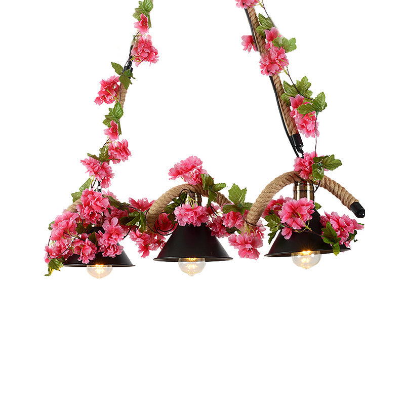 Black Conical Metal Pendant Light with Twisted Rope and Fake Flower - 3-Light Ceiling Fixture for Restaurants and Warehouses
