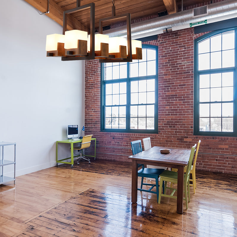 Rustic White Glass Square Restaurant Island Light With 8 Lights & Bronze Ceiling Mount -