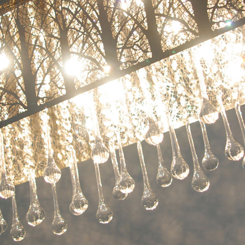 This product is a white, rectangle island light with a modern design. It has 3 heads and is made with waterdrop crystal and a forest pattern. The light is LED and the voltage is 220V-240V 110V-120V. The bulb base is E12/E14.