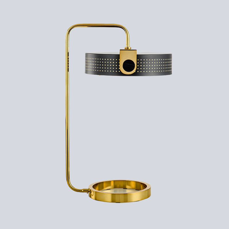 This floor lamp is a sleek and modern lighting solution for any bedroom. The sleek metal design features a hollow metal shade in a drum shape. The shade is black, and the lamp base is gold. The lamp is compatible with LED, incandescent, and fluorescent bulbs (not included). The voltage is 220V-240V or 110V-120V.
