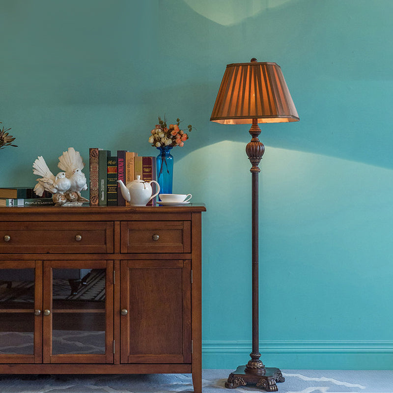 The "Plated Fabric Trapezoid Shade Floor Lamp Classic 1 Bulb Dark Coffee Floor Standing Lamp with Wood Base" is a floor lamp that features a trapezoid-shaped shade made of plated fabric in a dark coffee color. The shade is supported by a wooden base in a matching dark coffee color. The lamp takes one standard E26/E27 bulb (not included) and is compatible with LED, incandescent, and fluorescent bulbs. The voltage is 220V-240V 110V-120V.