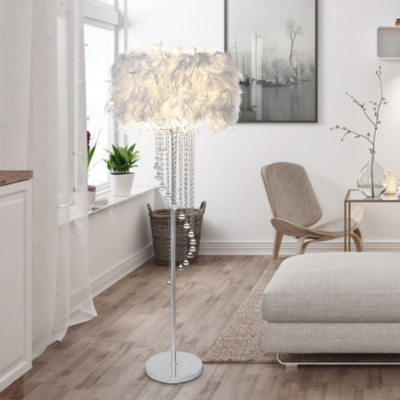 Modern Drum Standing Lamp Feather 1-Light Floor Light in Red/White with Crystal Spiral Drape - Stylishly Enhance Your Living Room