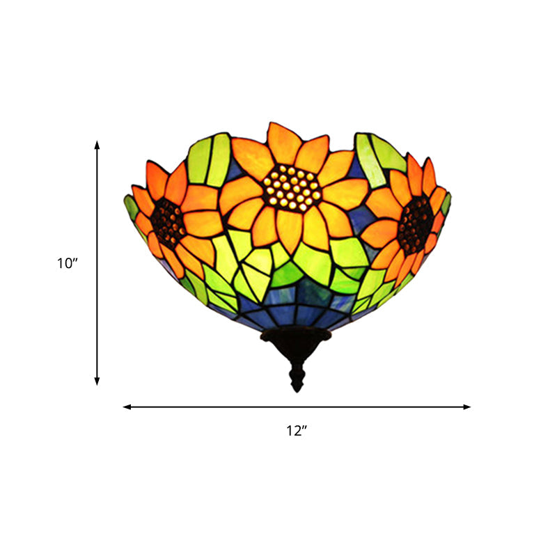 This product is a wall light in the shape of a sunflower. It is made of stained glass and is available in orange. It is 10 to 14 inches in size and has a medium base. The bulb is not included.