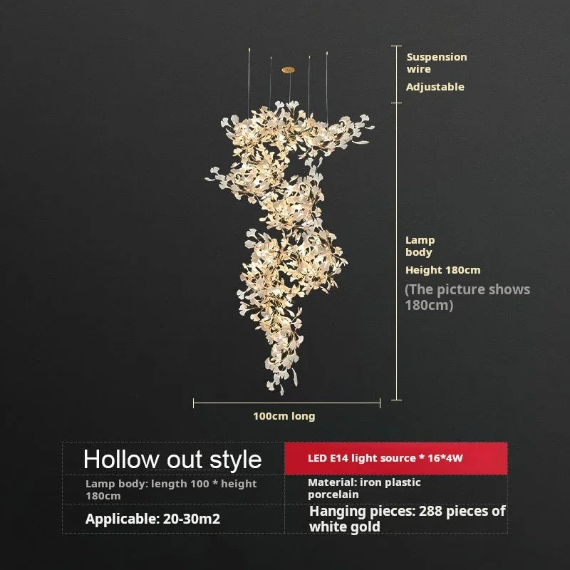 Crafted from premium aluminum with ginkgo branch-inspired detailing, it merges artistry with functionality, making it a true statement light for high-ceiling spaces.