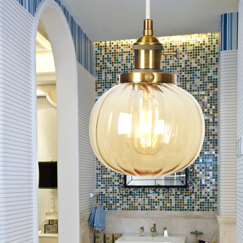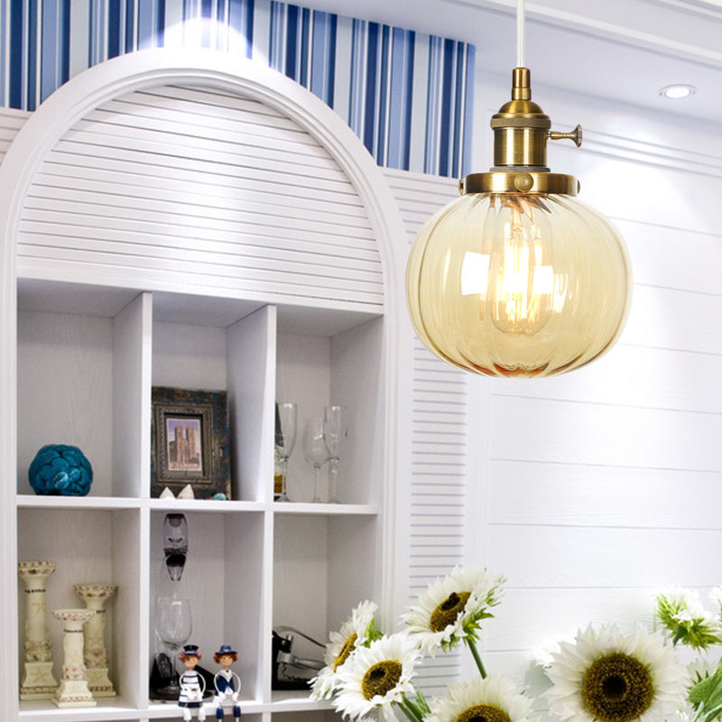 Vintage Style Amber/Clear Ridged Glass Pendant Light Fixture - 1 Light - Adjustable - Living Room Ceiling Light - Black/Bronze/Brass