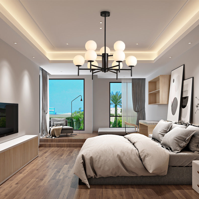 Contemporary Black/Gold Globe Chandelier with Radial Design - 6/8/9 Lights, Milk Glass Hanging Lamp