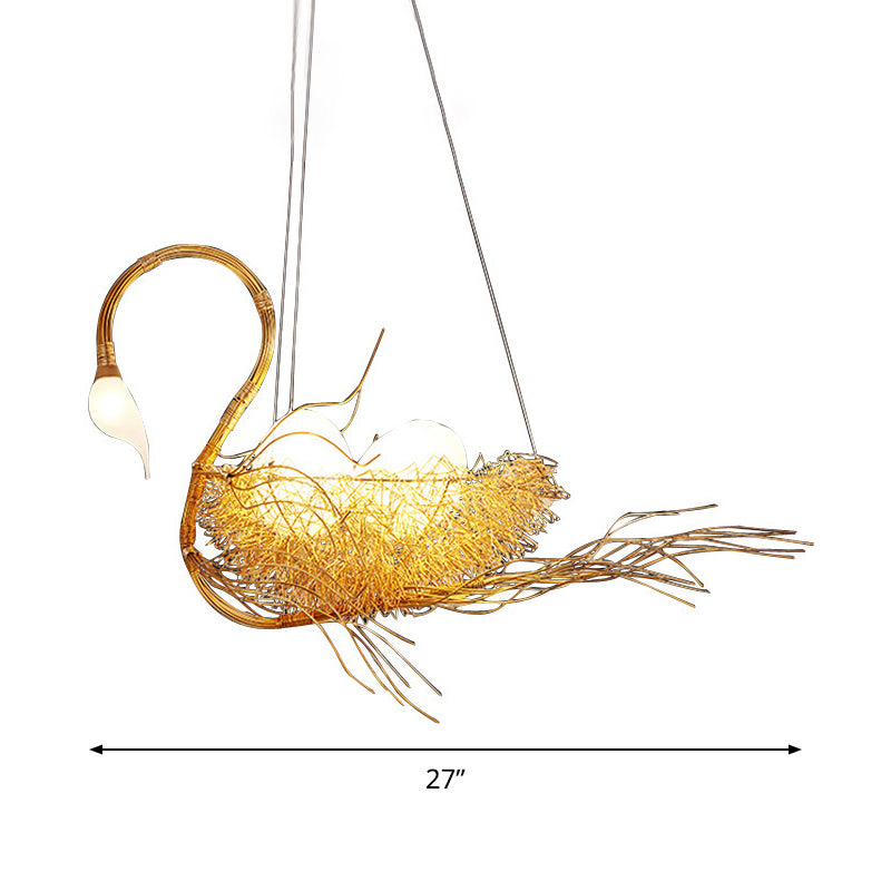 This is a Gold Goose Shape Chandelier Light that is perfect for adding a touch of elegance to any room. It features a metal body with a frosted glass shade in a white finish. The chandelier has a round canopy and 3 lights. It is rated for use with 220V-240V 110V-120V.