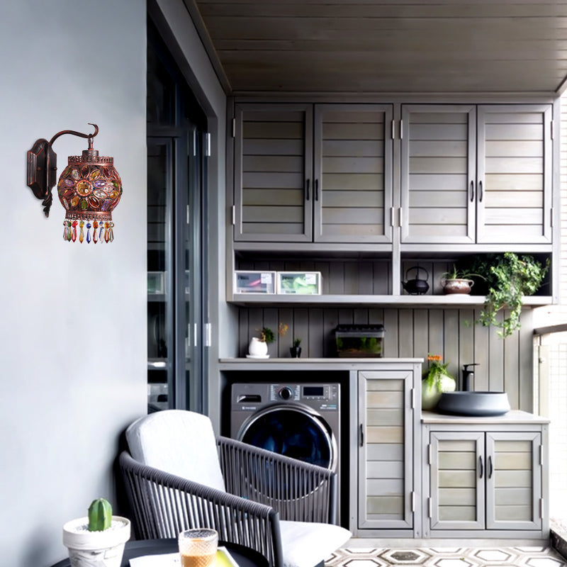Bohemia Lantern Wall Sconce Metal 1-Light Lamp With Crystal Flower Design Antique Copper