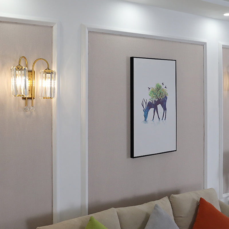 Vintage Gold Metal Gooseneck Wall Light With Clear Crystal Shade - Cylindrical 1/2-Bulb Sconce