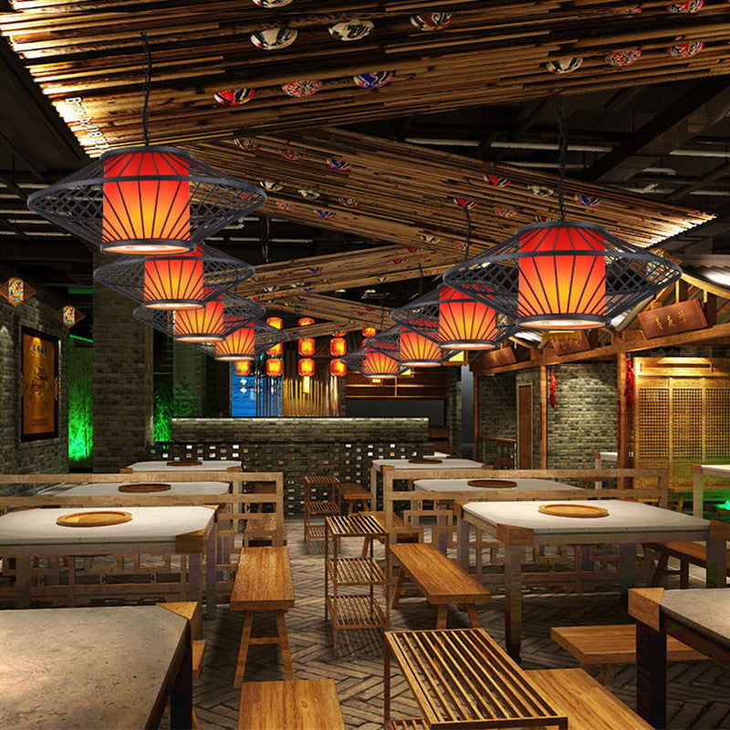 This product is a 16/19.5/23.5 wide single fabric pendulum pendant. It is a simple red/yellow cylindrical ceiling lamp with a black iron tapered frame. The product is made of fabric and has a voltage of 110V-120V 220V-240V. The bulb base is E26/E27. The light type is LED/Incandescent/Fluorescent.