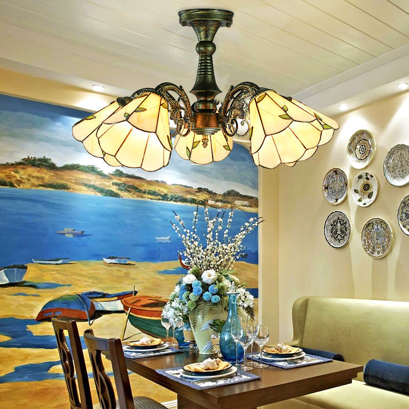 This Tiffany-style ceiling light features a stained glass shade in a leaf, peacock tail, or flower design. It comes in antique bronze and has 3 or 5 lights. LED, incandescent, and fluorescent bulbs are all compatible.
