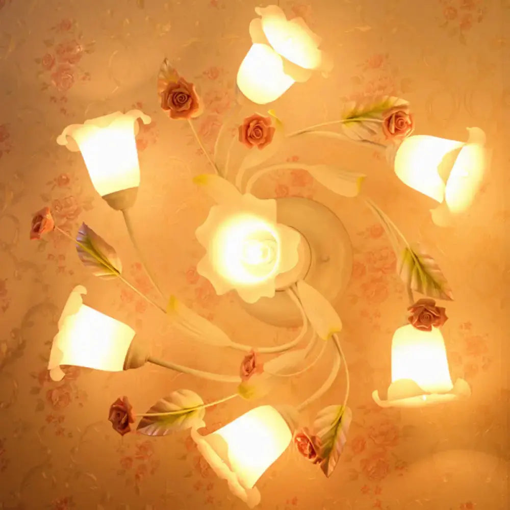 American Garden Swirl Living Room Semi Flush Light - Metal 4/7-Head White Lamp with Frosted Glass Shade