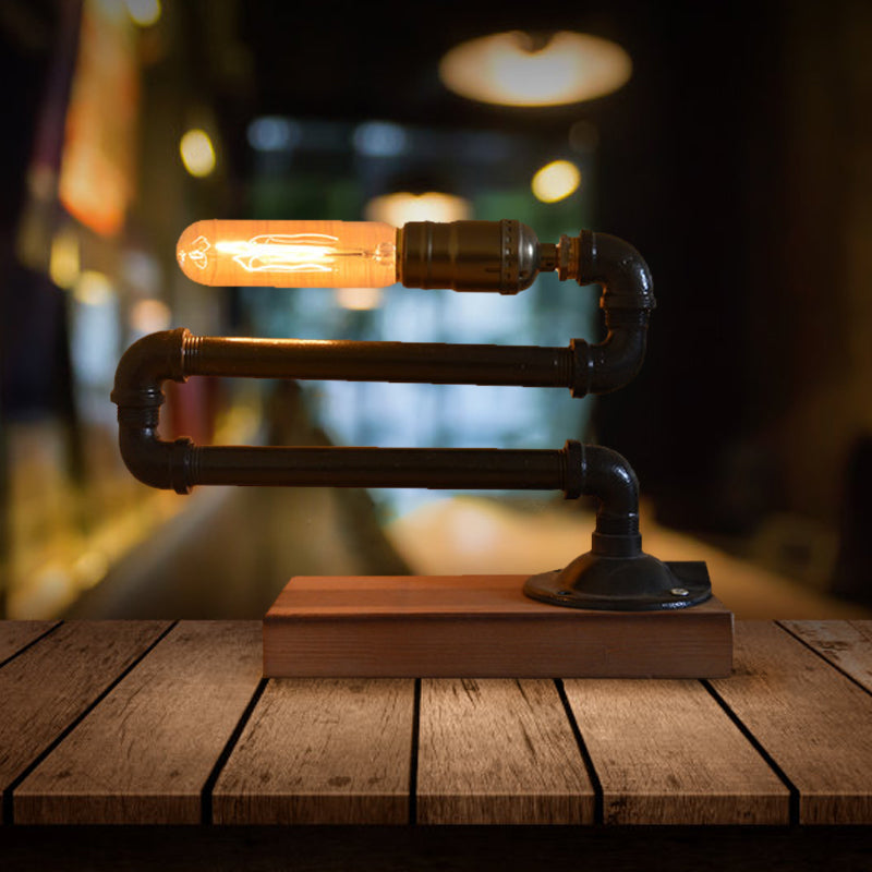 Farmhouse Style Black Metal Table Lamp with Wooden Base and Piped Bulb