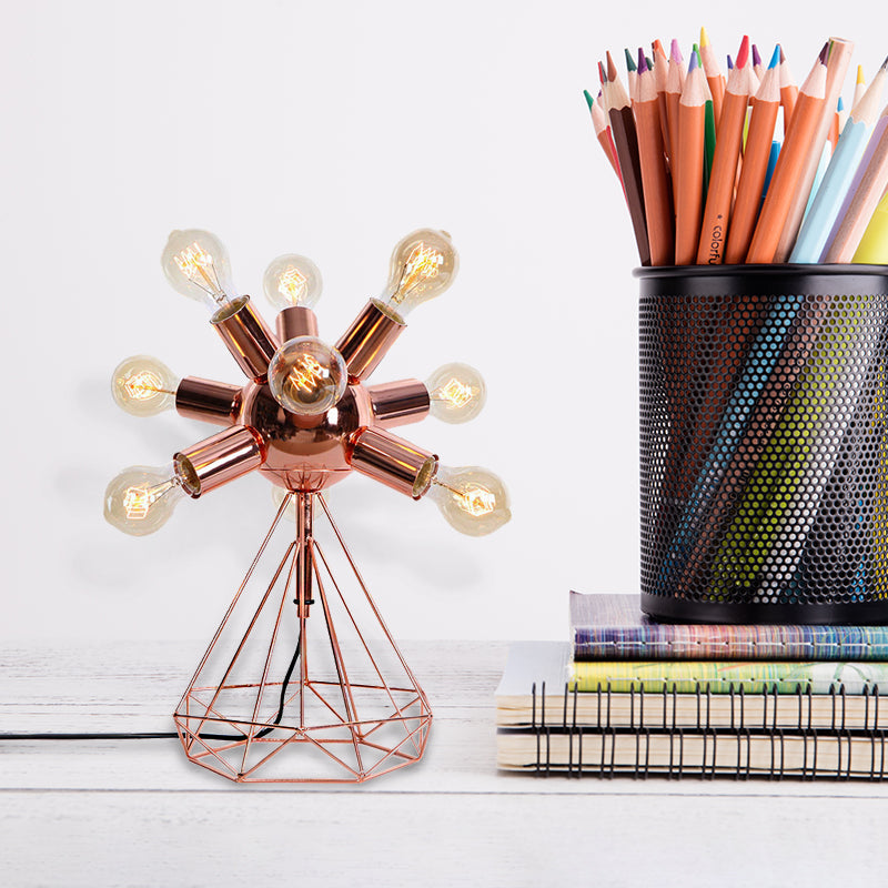 Retro-Style Metal Table Lamp with Diamond Base - 6/9-Head Bare Bulb, Copper Finish - Bedroom Lighting Solution