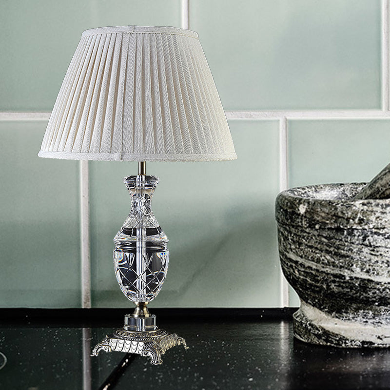 This product is a traditional style table light in the shape of an urn. It is made of crystal and is beige in color. It is 22" in height and 16" in width. The shade is made of fabric and is barrel-shaped. The light type is LED, Incandescent, or Fluorescent and the bulb base is E26/E27. The voltage is 220V-240V 110V-120V.
