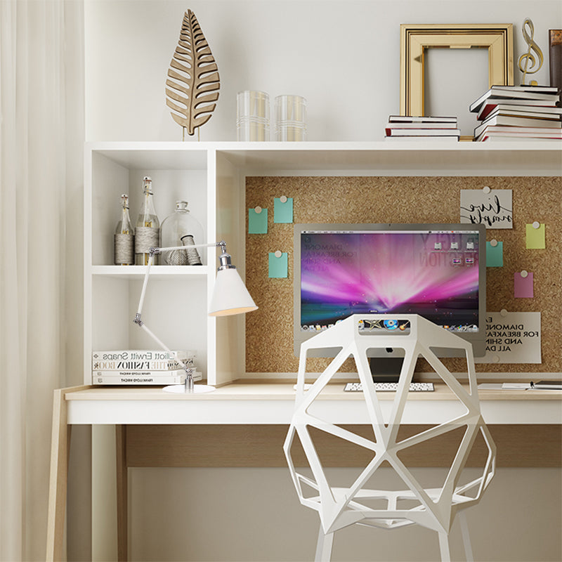 This product is a metal, conical desk lamp with an adjustable arm in white. It is designed in a vintage, industrial style and can be used with LED, incandescent, or fluorescent bulbs. The arm length is 8"+8"/8"+8"+8", and the backplate width is 7". This product is 110V-120V voltage and E26/E27 bulb base.