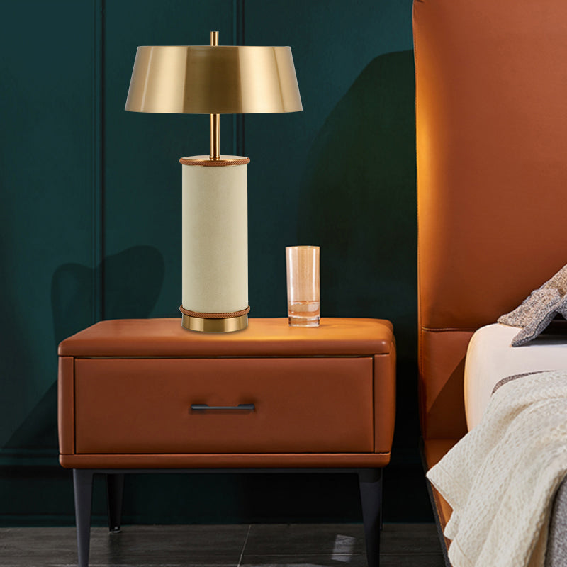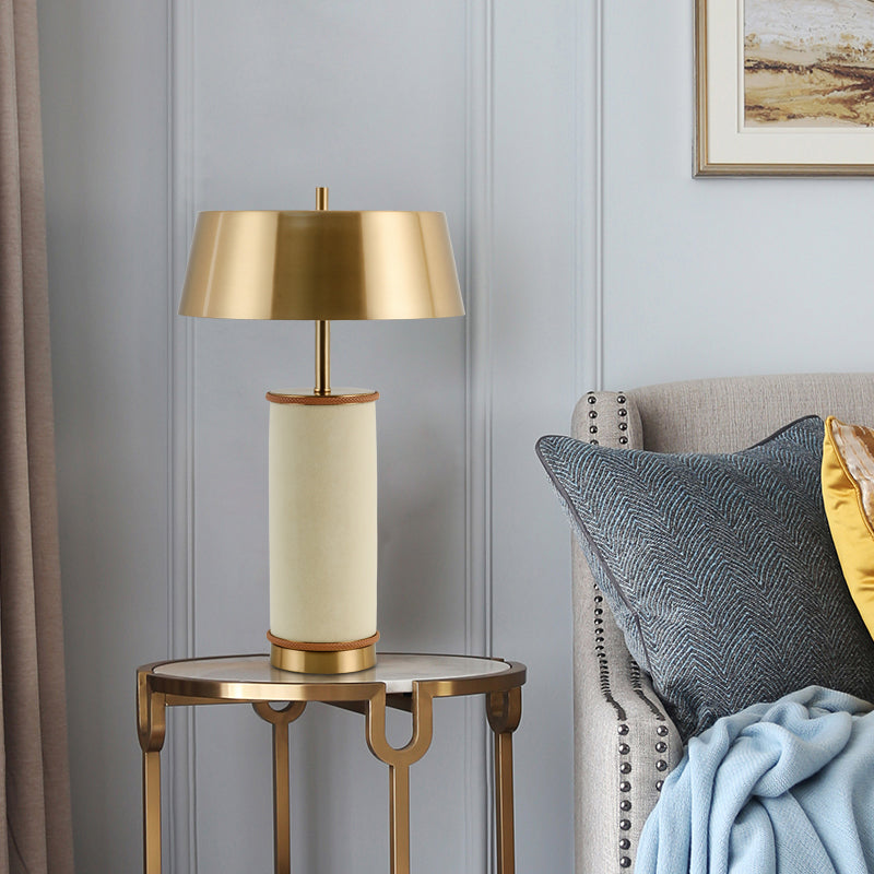 This lamp features a sleek and modern design that will look great in any room. The metal construction is durable and the white finish gives it a clean and fresh look. The shade is made of gold metal and is in the shape of a drum. The bulb is not included but the light can be used with an LED, incandescent, or fluorescent bulb. The voltage is 220V-240V 110V-120V and the bulb base is E26/E27.