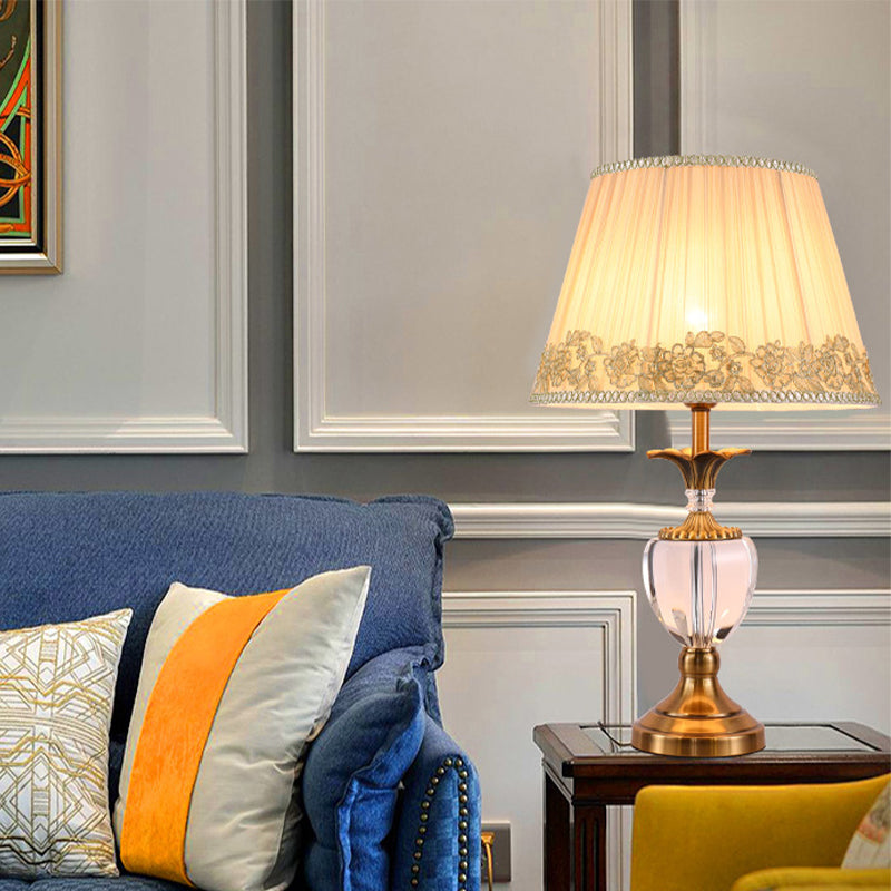This product is aJar Shape Task Lighting Modernism Hand-Cut Crystal 1 Bulb Small Desk Lamp in Beige. It features a unique barrel shade design made from beige fabric, and it is delicately hand-cut from high quality crystal. The lamp also includes a voltage of 220V-240V 110V-120V and a bulb base of E26/E27, making it ideal for use with LED, incandescent, or fluorescent bulbs.