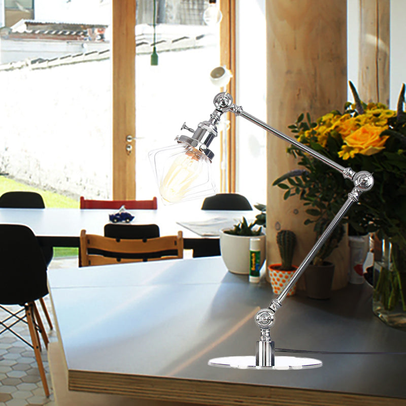 This lamp features a metal base and an adjustable arm, making it perfect for reading or tasks. The lamp shade is a clear amber glass with a metal trim. The vintage-inspired design is perfect for adding a touch of elegance to any room.