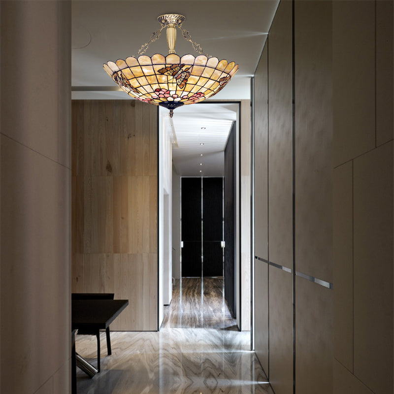 Tiffany Style Semi-Flush Ceiling Light with Butterfly, Rose & Fruit Shell Shade