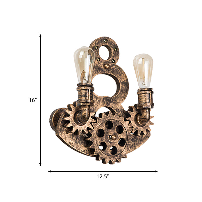 Vintage Metal Wall Mount Light Fixture - Bare Bulb Sconce With Brass Finish And Gear Deco 2-Light