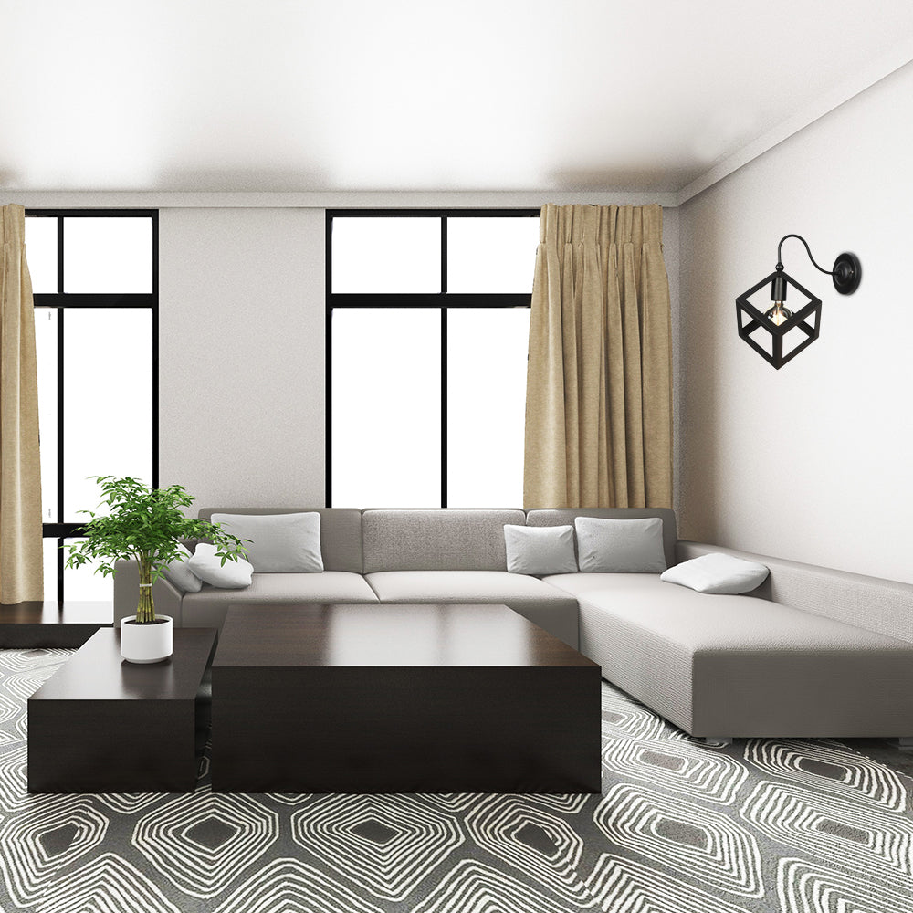 This lamp measures 11” in height and 12” in depth. It is adjustable from 10” to 14” in length, making it ideal for any room size. The shade measures 11” in width and the backplate width 5”. The light has a voltage of 110V-120V 220V-240V and can be powered using direct wired electric. It has a stylish industrial style, making it perfect for interiors with a modern feel and is suitable for use in the bedroom and other indoor areas. With rust black finish and cube cage design, this wall lamp will look great in any decor style.