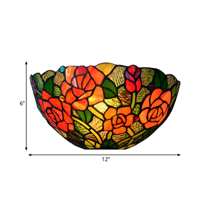 This Victorian metal and glass wall lamp has a yellow finish and a cut glass bowl shade with a rose pattern. It measures 10 to 14 inches wide, 6 inches tall, and has a 12-inch width. The glass shade is included. This wall lamp uses one LED, incandescent, or fluorescent lightbulb with a 110-120 volt voltage and has a Direct Wired Electric power source.