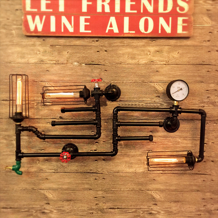 Steampunk Black Piping Wall Sconce Lamp with Wire Guard and Gauge - 3 Heads Metal Wall Lighting