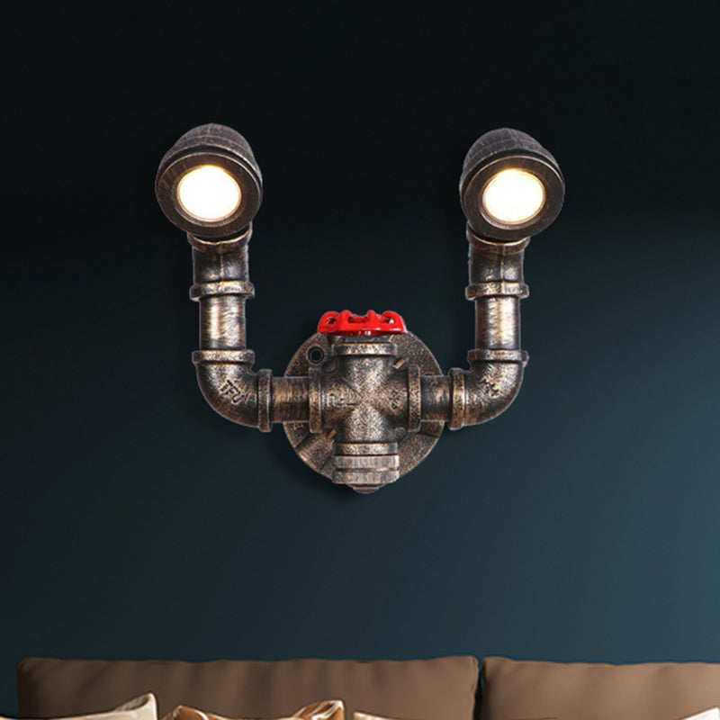 This product is an aged brass two lights wall light fixture with a rustic and stylish design. It is made of a wrought iron pipe with a water valve and includes a metal material shade. The size of the fixture is 5 to 9 inches and it has a depth of 8 inches. It is designed to be direct wired electric with a voltage of 220V–240V and 110V–120V. The light type and bulb base are both LED/Incandescent/Fluorescent and E26/E27, respectively. It can feature an indoor wattage of up to 40W and provides a fixture height of 9 inches or less and a shade width of 6 inches. With a total height of 7.5 inches, the unit does not include the light bulbs.