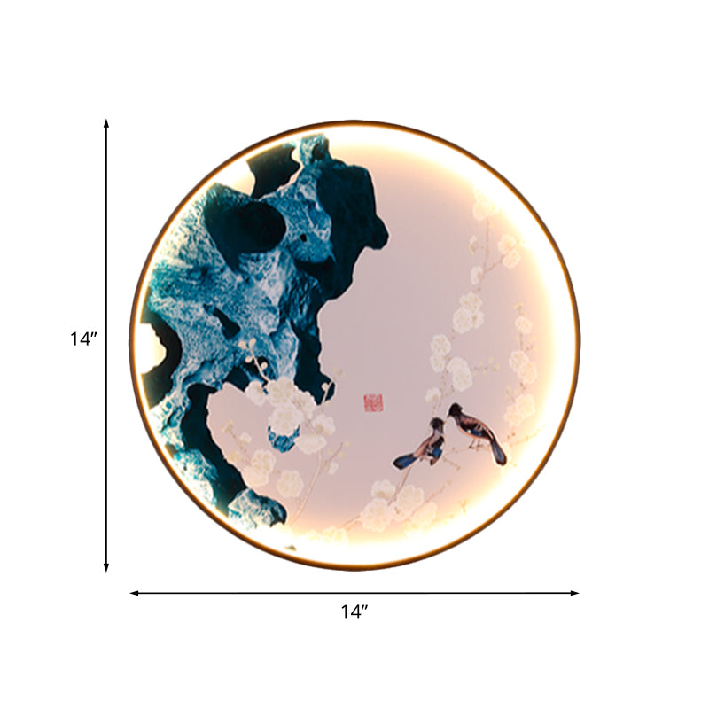 Black Halcyon LED Wall Mural Light - Asian-inspired Mountain and Pine Tree/Bird Painting - Enhance Ambiance with Fabric Shade